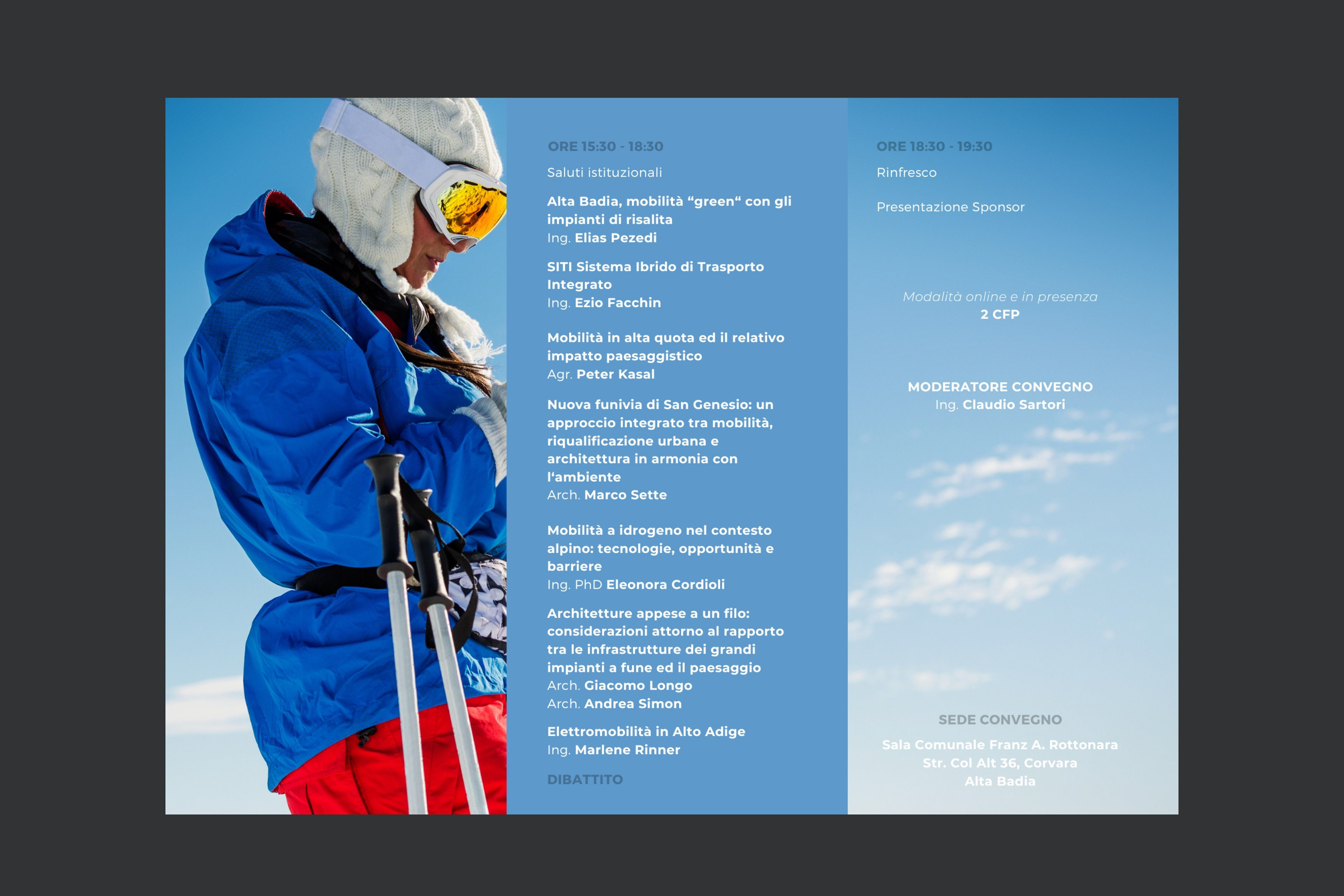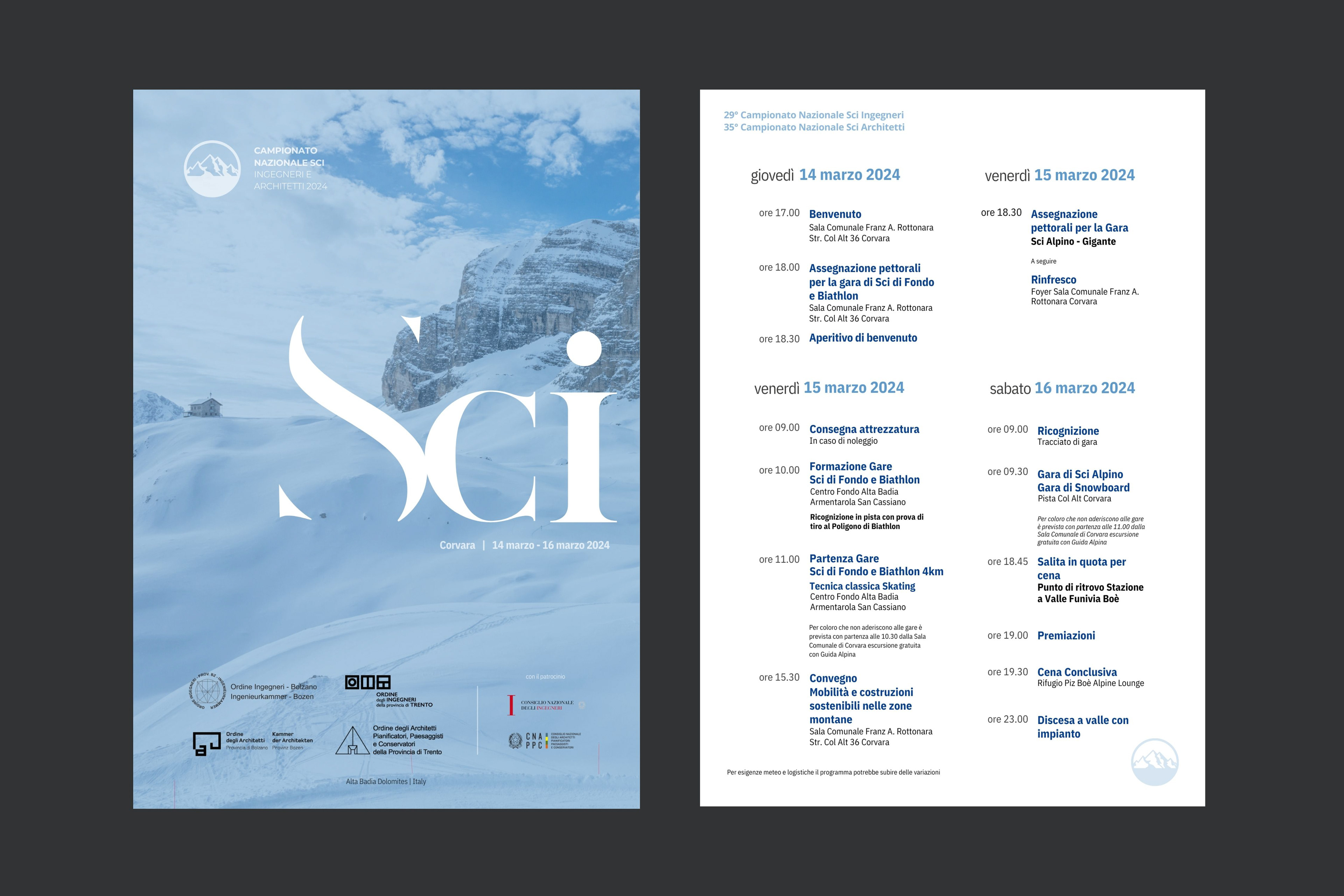 I collaborated with the Ordine degli Ingegneri di Bolzano on the Visual Communication of a multi-day event combining skiing activities and professional conferences. My role focused on designing clear and minimal Graphic materials, including Flyers, Posters and informational content for Conferences and side events. The project required structuring effective visual communication for an institutional audience and involved collaboration with engineering orders from across Italy, including the national office in Rome. It was a stimulating experience that combined event communication, design clarity and institutional coordination.